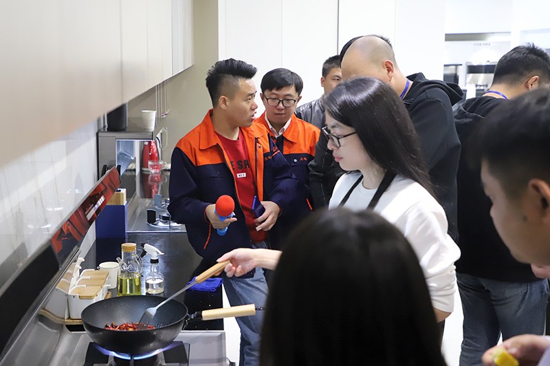 現(xiàn)場,工作人員演示了北斗星集成灶米家APP的物聯(lián)網(wǎng)功能,還演示A6蒸箱操作,并爆炒辣椒演示北斗星集成灶的超強(qiáng)吸力。意向加盟商們紛紛稱贊,“集成灶吸油煙效果那么好,沒想到還這么智能!”