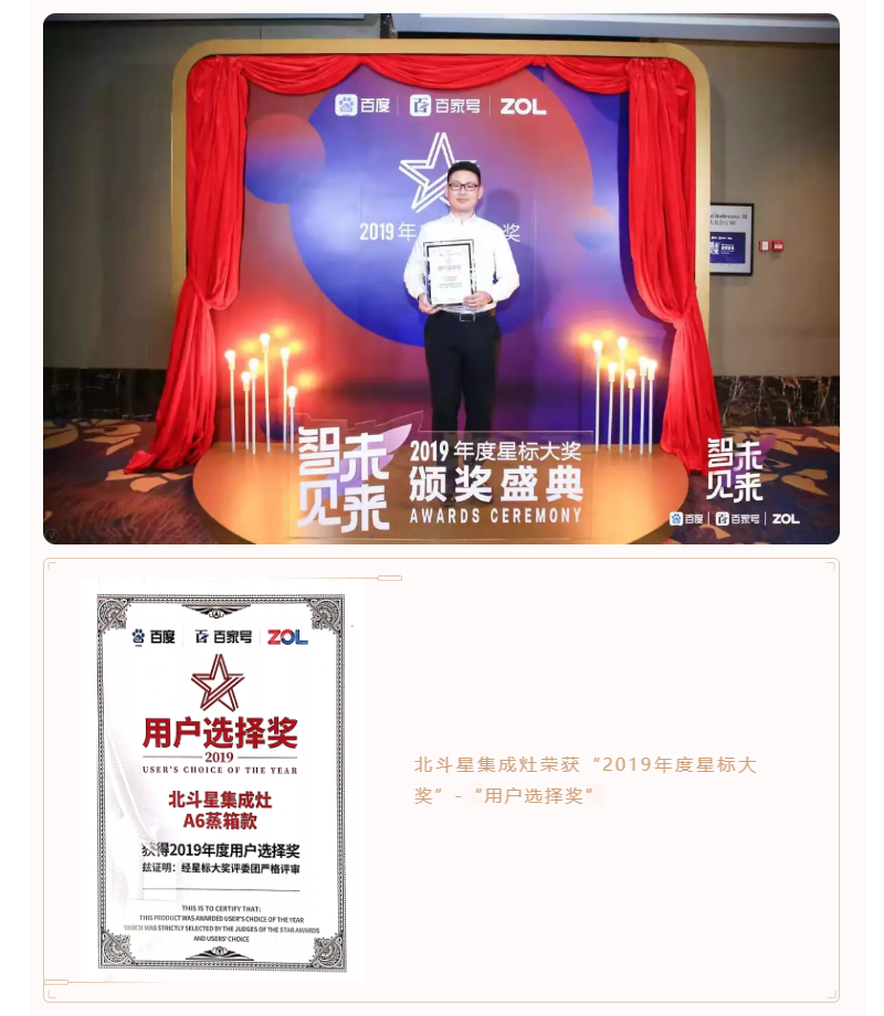北斗星集成灶榮獲由ZOL&百度聯合頒發的“智見未來 2019年度星標大獎”-“用戶選擇獎”