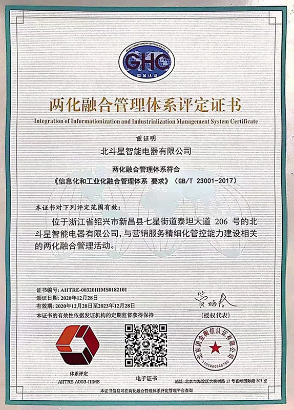 重磅!北斗星智能電器榮獲兩化融合管理體系評定證書