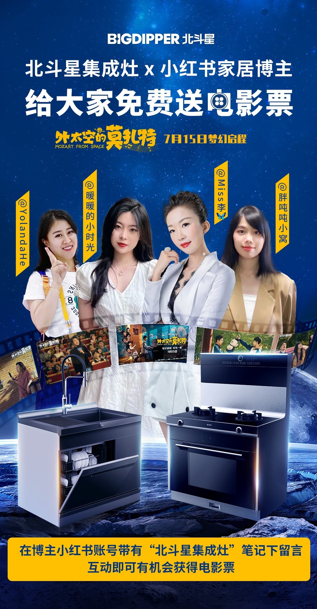 參與方式3:打開小紅書APP,搜索海報內博主IP名稱 @Miss李@YolandaHe @胖噸噸小窩 @暖暖的小時光,在帶有“北斗星集成灶”的相關筆記/視頻評論區(qū)進行互動留言~將有機會獲得《外太空的莫扎特》電影票哦!